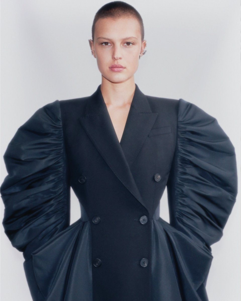 A compact wool and polyfaille pieced coat with an exploded sleeve volume and a butterfly-draped skirt. Discover the