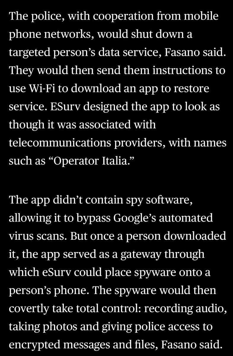 The novel way police in Italy hacked suspects' phones: 1) Get cell network to turn off suspect's data service, 2) Send suspect a text telling them to use WiFi to download an app from the Play Store to fix the issue, 3) use that app to deliver spyware.