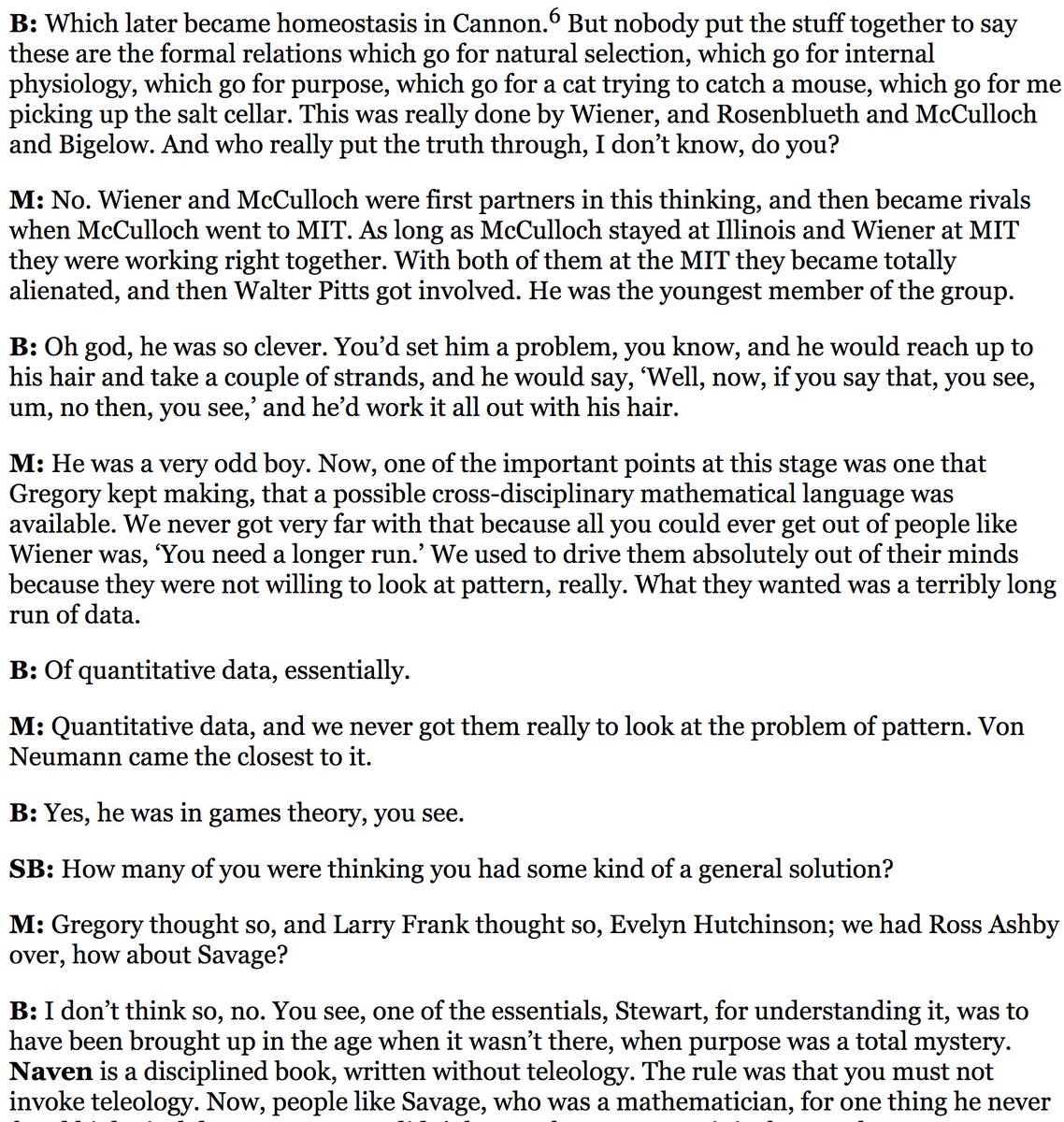Startling window into pre-bureaucratic science, when the leading physicists, psychiatrists, statisticians, anthropologists, computer geeks, and neuroscientists talked to each other as equals. A lost world, recalled in a 1976 @stewartbrand interview: http://www.oikos.org/forgod.htm pic.twitter.com/O0hHecXRvd