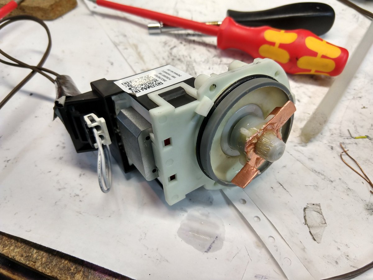 The rotor assembly needs to resonate at 60hz to start, so I thought that my metal impeller may have added too much inertia. I removed two of the vanes and it would start in air, but not in water.pic.twitter.com/ZGlDlOtc2w
