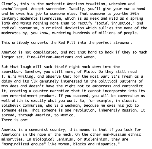 The block of text was the output of a Markov sampler (Dissociated Press) applied to Moldbug’s “Brown Scare” (url below). I’ve searched the page now for the “Bioleninism” bit, and it’s from footnote 5, which was added by the editor, and links you. https://www.unqualified-reservations.org/2013/09/technology-communism-and-brown-scare/ …