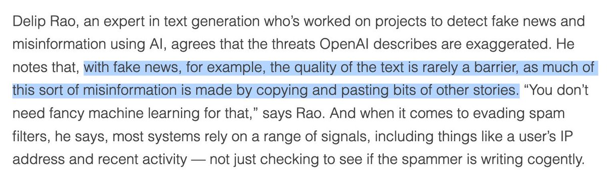 Generative networks for text may well just be the solution to misinformation even if early on they are a cause of it:https://www.youtube.com/watch?v=UcupVZ0fMuE …