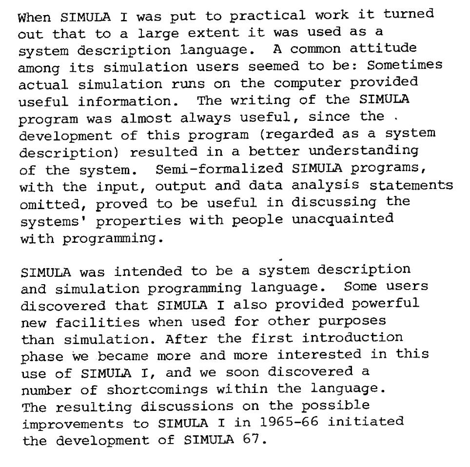 The motivations for Simula 67 (and so OOP) were dual. Simula I’s fixed event loop was restrictive; they wanted a language within which it could be expressed, to give greater flexibility. And, they loved Algol 60 except for its numerous deficiencies, which they hoped to fix.pic.twitter.com/3KYnsQ0uuq
