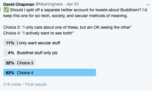 Interesting sample selection problem here: presumably voters mostly already follow me, and so are OK with a mixture of topics. However, a strong outcome given that limitation! Thank you so much for voting, and for your interest! And I apologize to those who'd prefer only one.pic.twitter.com/XHGslwmxSt