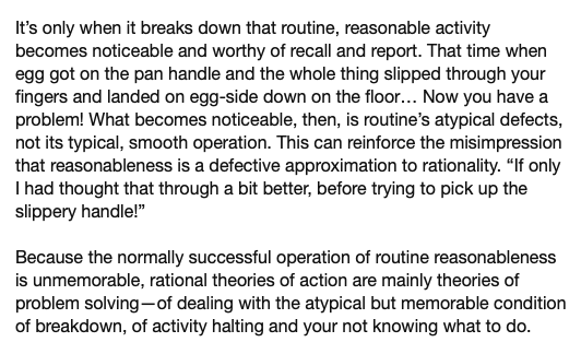 Rational theories of action are actually theories of activity breaking down; of baffled inaction in the face of failure. (This is the central point in Dreyfus’s take on Heidegger; I’m just adding breakfast.)pic.twitter.com/KqT8muTHsO