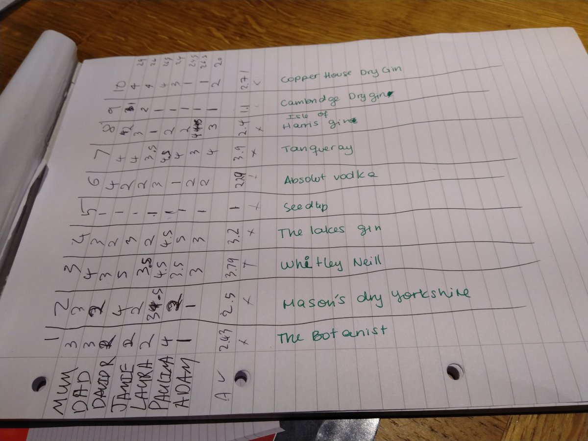 Verdicts: * by average score tanqueray remains top, because nobody hates it and everyone thinks it's pretty good. * Whitley Neill is a close second and much more interesting * Botanist is way less classy than it bills itself as and tastes brash and cheap * Seedlip is awful