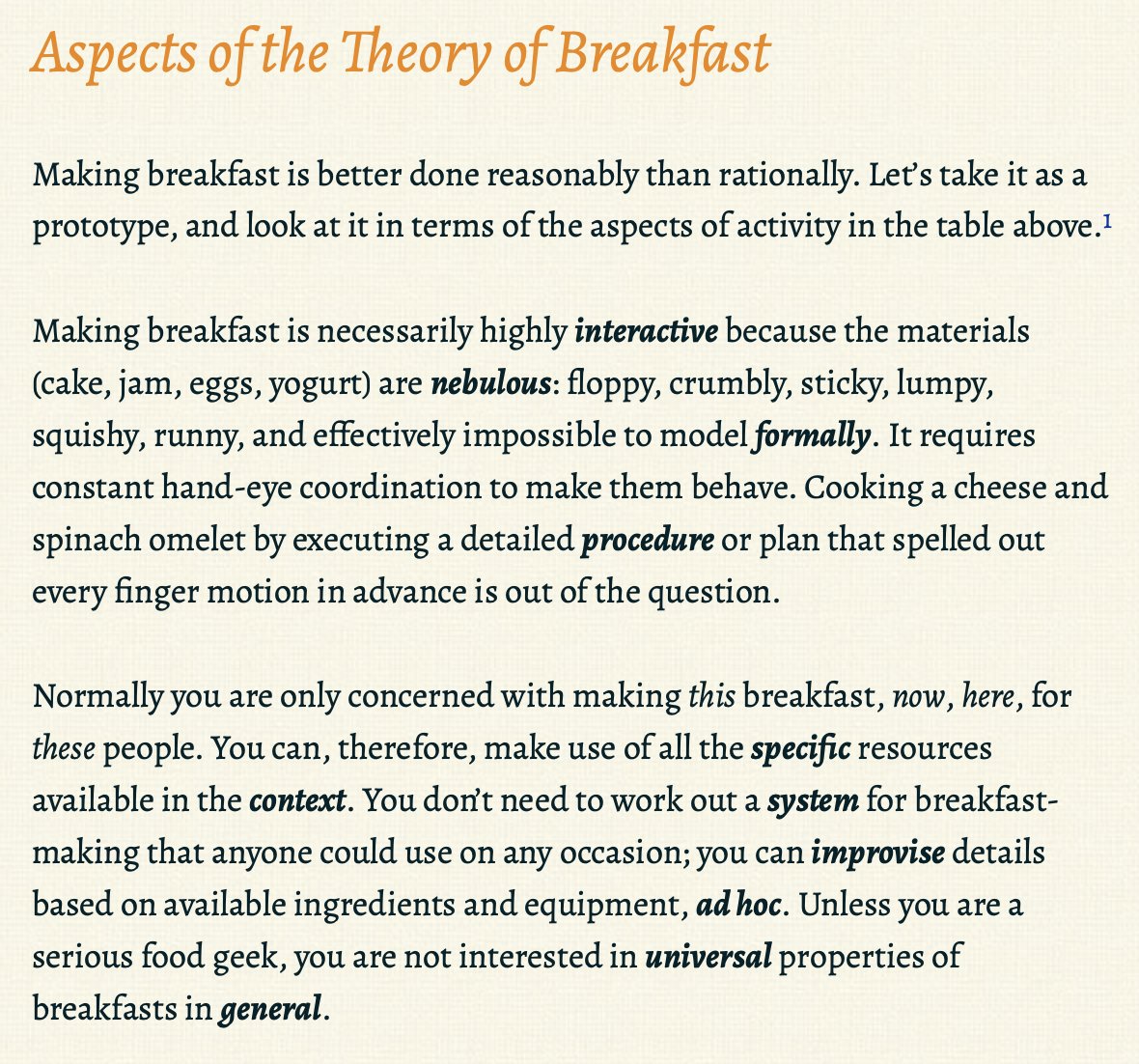 “Aspects of the Theory of Breakfast” Formal rationality is not much help in making an omelet! Here’s a better way… The title is a play on Noam Chomsky’s “Aspects of the Theory of Syntax,” a founding text in cognitivism. https://meaningness.com/eggplant/reasonableness-aspects …pic.twitter.com/v6m9zVJJUy
