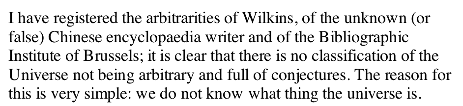 You may know Borges' "Celestial Emporium of Benevolent Knowledge," a ridiculous categorization scheme for animals. But did you know this is commentary on Wilkins' "universal language"? Borges foresaw the ontology problems that would plague symbolic AI. https://en.wikipedia.org/wiki/The_Analytical_Language_of_John_Wilkins …pic.twitter.com/hSyQgtPARk