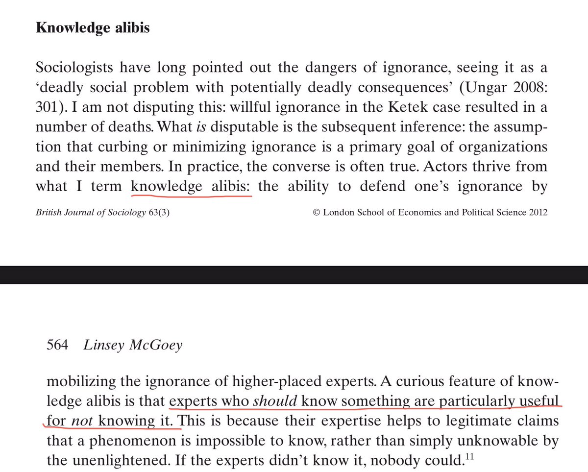 “...experts who *should* know something are particularly useful for *not* knowing it.” https://www.researchgate.net/profile/Linsey_Mcgoey/publication/230803188_The_Logic_of_Strategic_Ignorance/links/5a00608f0f7e9b62a14d622e/The-Logic-of-Strategic-Ignorance.pdf … pic.twitter.com/sDStnyEkDb