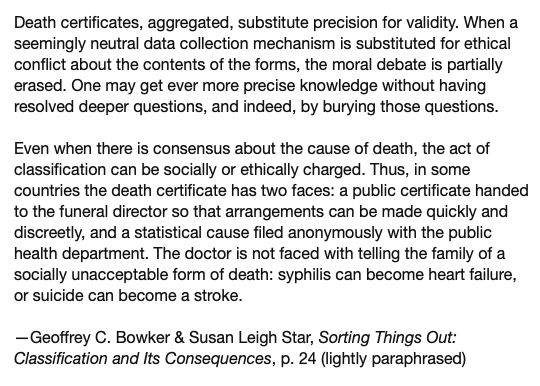 A deep dive into the ontology and ethics of the international cause-of-death codes, _Classification and its Consequences_ casts light on this insightful observation from @paulgpic.twitter.com/7cvRDPQ2il