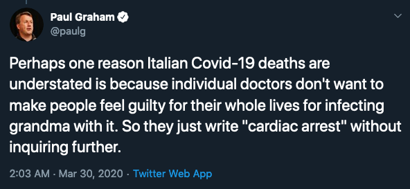 There's that for sure. But there's also difference between death by covid19 and death with covid19, ie due to aggravated pre-existing conditions. Tho not sure italian and spanish doctors are recording that accurately either.