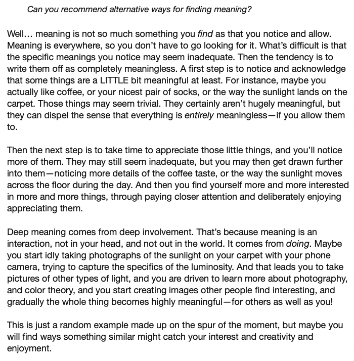 Meaning is not something to search for. If life seems meaningless, searching makes that worse. Better to notice and allow the meanings that are everywhere, even if they seem trivial and inadequate. Attention, appreciation, and involvement with details intensifies meaning.pic.twitter.com/GrNf1XSsRY