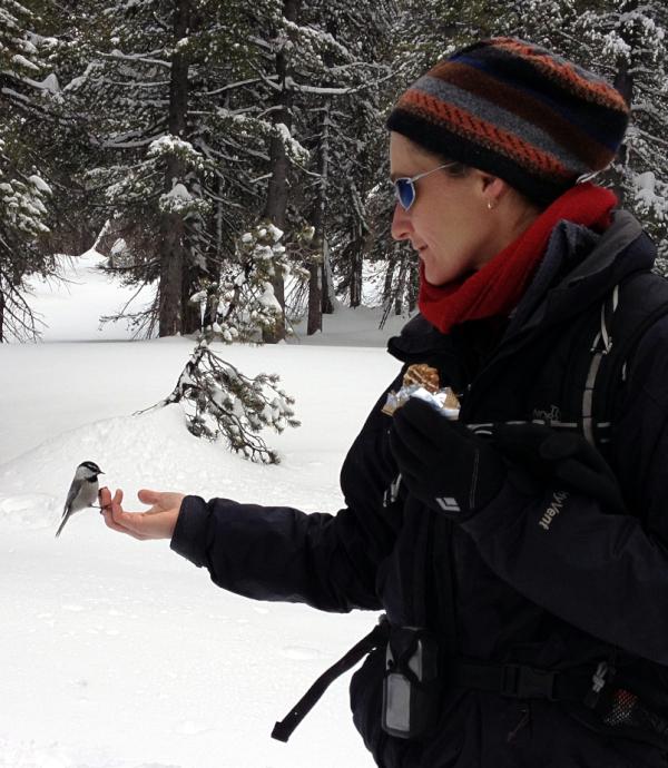 Snowshoeing yesterday, @Awbery feeds a chickadee from her handpic.twitter.com/XQyDvVfX