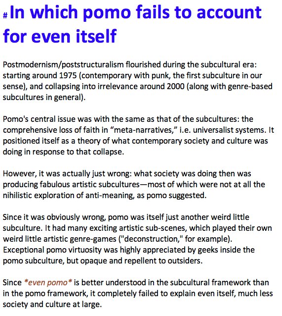 why should it explain itself? by ‘pomo’ you are referring to (and blithely dismissing) all of poststructuralism?