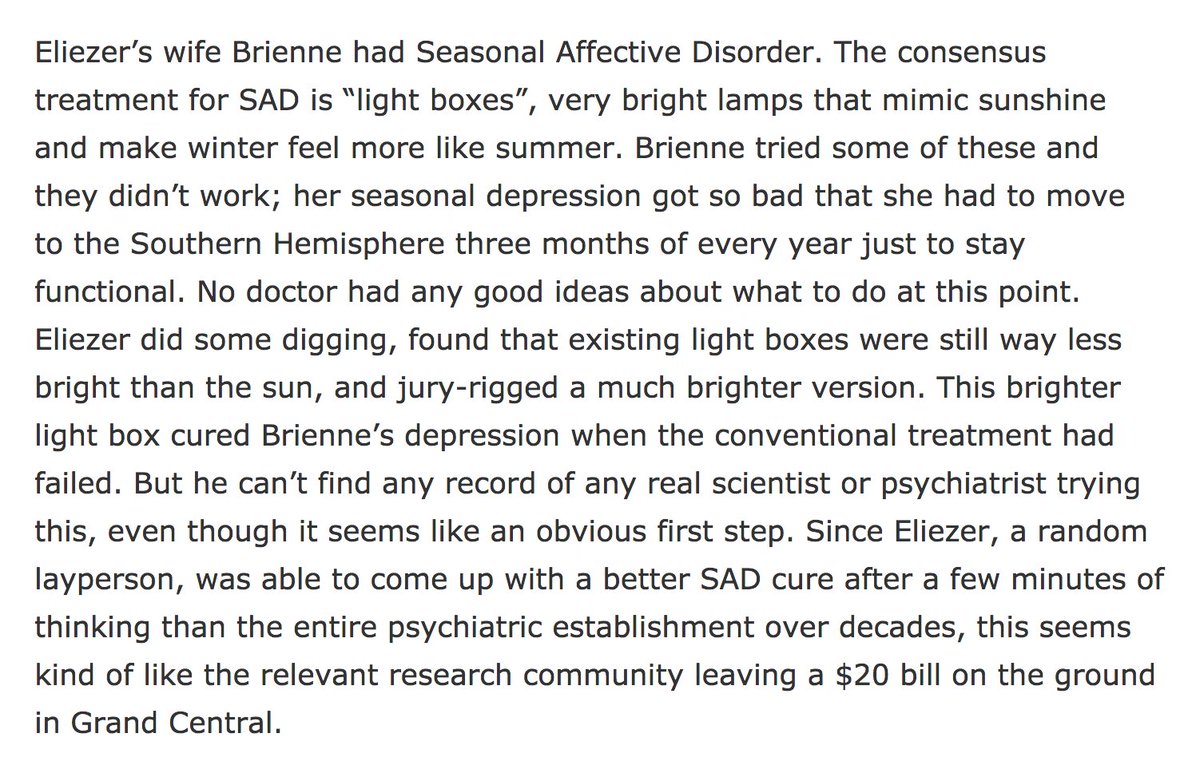Well, *that*’s interesting! n=2: Eliezer Yudkowsky came to the same conclusions I did about SAD lights. (Viz., you need MUCH brighter ones!) http://slatestarcodex.com/2017/11/30/book-review-inadequate-equilibria/ …pic.twitter.com/JyKgkC9yOS