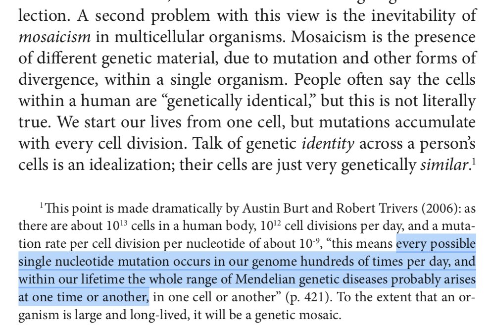 An organism cannot be defined as an aggregate of genetically identical cells, because there aren’t any of those. You are diverse; you contain multitudes. You include every possible genetic disease! (From Peter Godfrey-Smith’s _Philosophy of Biology_, h/t @againstutopia)pic.twitter.com/ExtJ63hu4D
