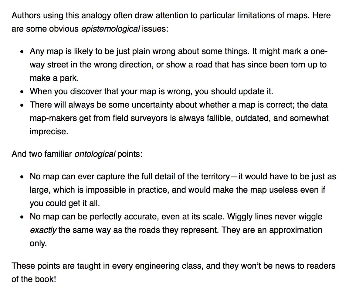 Hm, somewhat obvious, but the uhh... mapping from literal maps & territories to the more general case maybe less so. eg "overarching universal ontology, combining all possible categorizations" seems like sthg I might have vaguely thought was possible before reading Meaningness