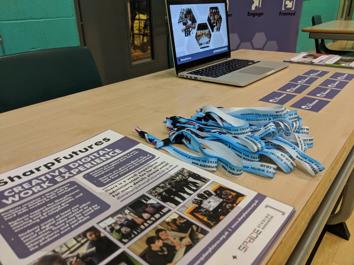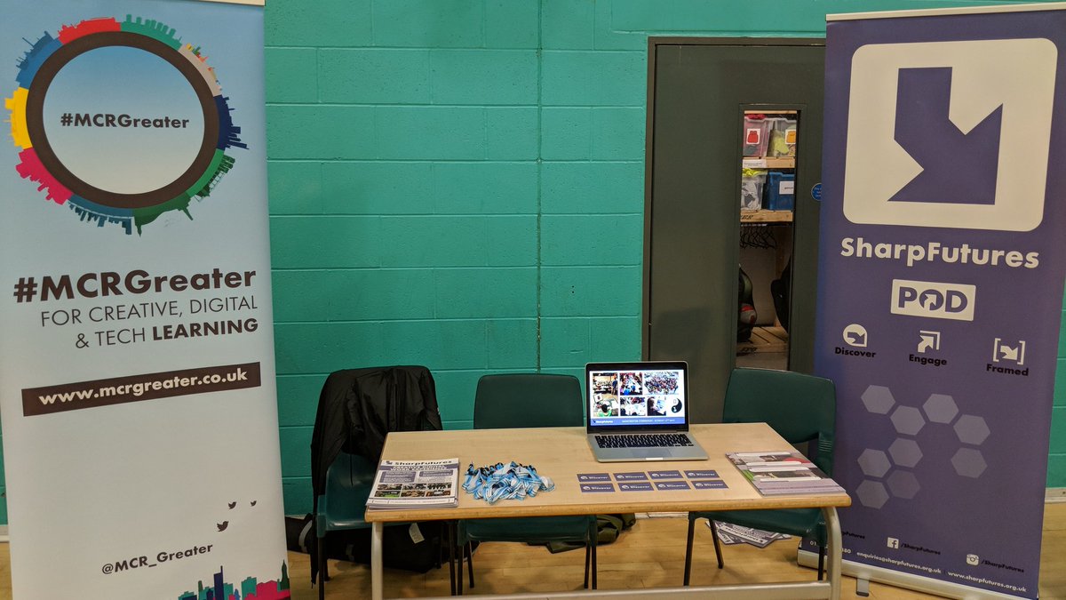 @McrDig's#DigitalFuturesCCC event today with@SharpFutures talking about careers in#CreativeDigital. Feel free to pick up some#MCRGreater wristbands and find out more about opportunities in#CreativeDigital in the Greater Manchester area through http://www.mcrgreater.co.uk pic.twitter.com/To5lzHnTvR