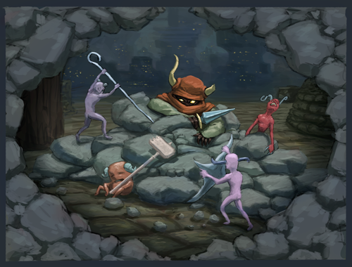 @MegaCrit Finished new card art for the Jorbs mod. Thought you guys might get a kick out of this one! The card "stone", applies slow, so I thought it would be fun to show Gremlin Leader a bit indisposed with his minions (most of them) trying desperately to get him free!pic.twitter.com/qOMkeyHluy
