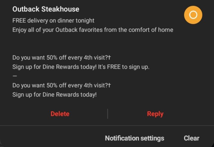 I have gotten probably a hundred "a message during Coronavirus/COVID-19" from companies and then there's Outback that's just like fuck all this free delivery ignore the pandemic