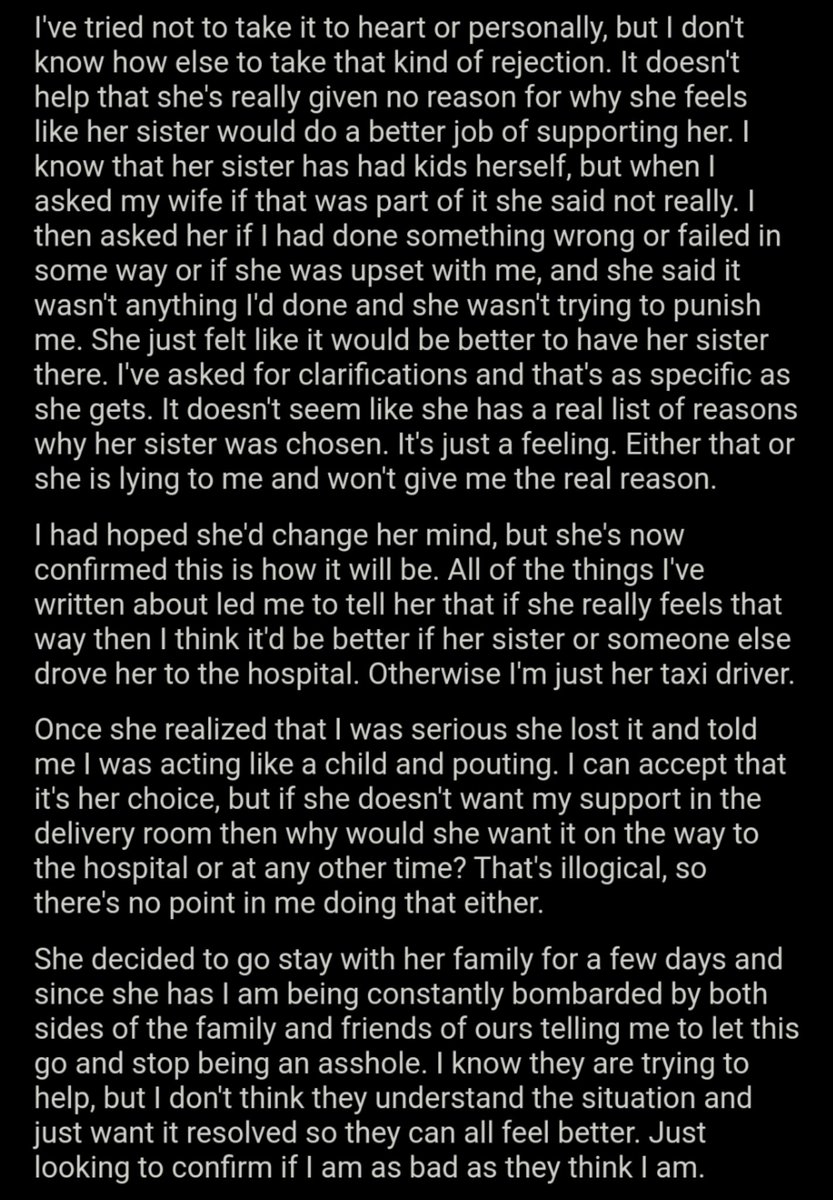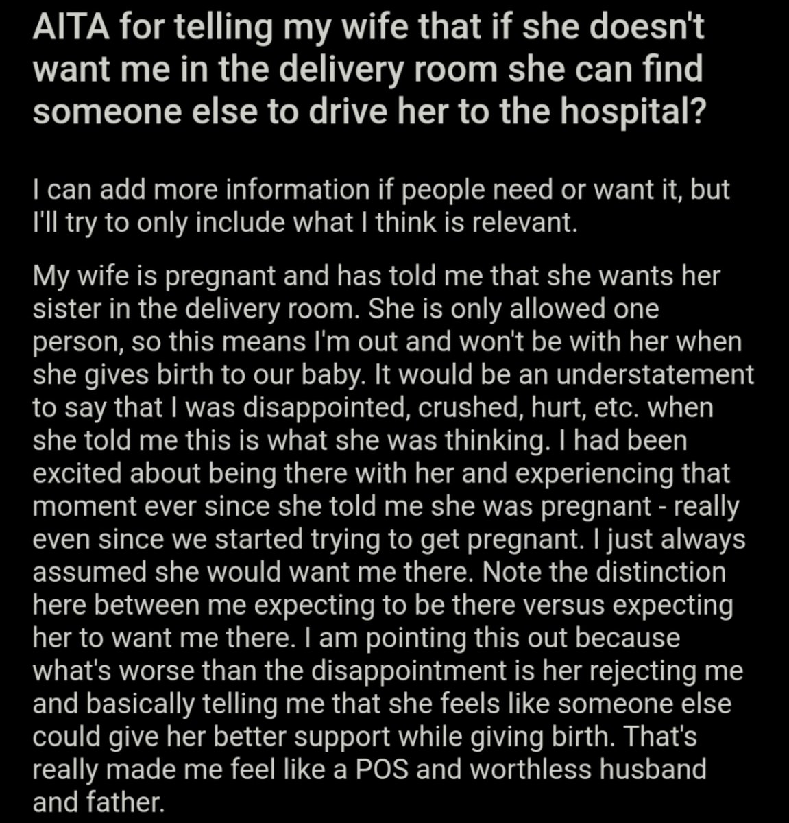 AITA for telling my wife that if she doesn't want me in the delivery room she can find someone else to drive her to the hospital? https://bit.ly/38yNJgT pic.twitter.com/PsIl6VzzZa