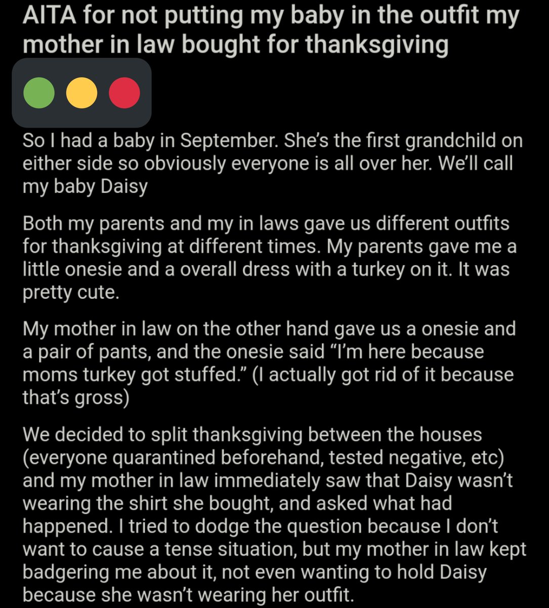 AITA for not putting my baby in the outfit my mother in law bought for thanksgiving? https://bit.ly/39mmMxt pic.twitter.com/96f24W9E6I
