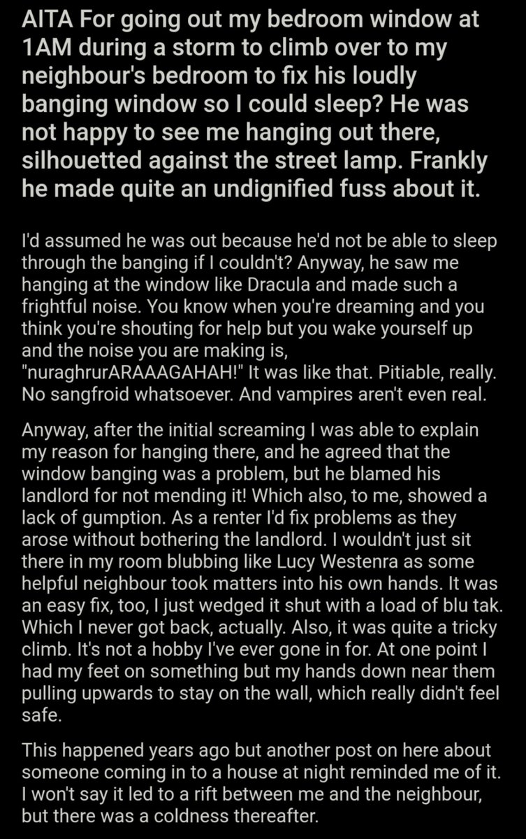 AITA For going out my bedroom window at 1AM during a storm to climb over to my neighbour's bedroom to fix his loudly banging window so I could sleep? He was not happy to see me hanging out there, silhouetted against the street lamp. Frankly he made... https://bit.ly/3lei4nu pic.twitter.com/ZdqYutdGsR