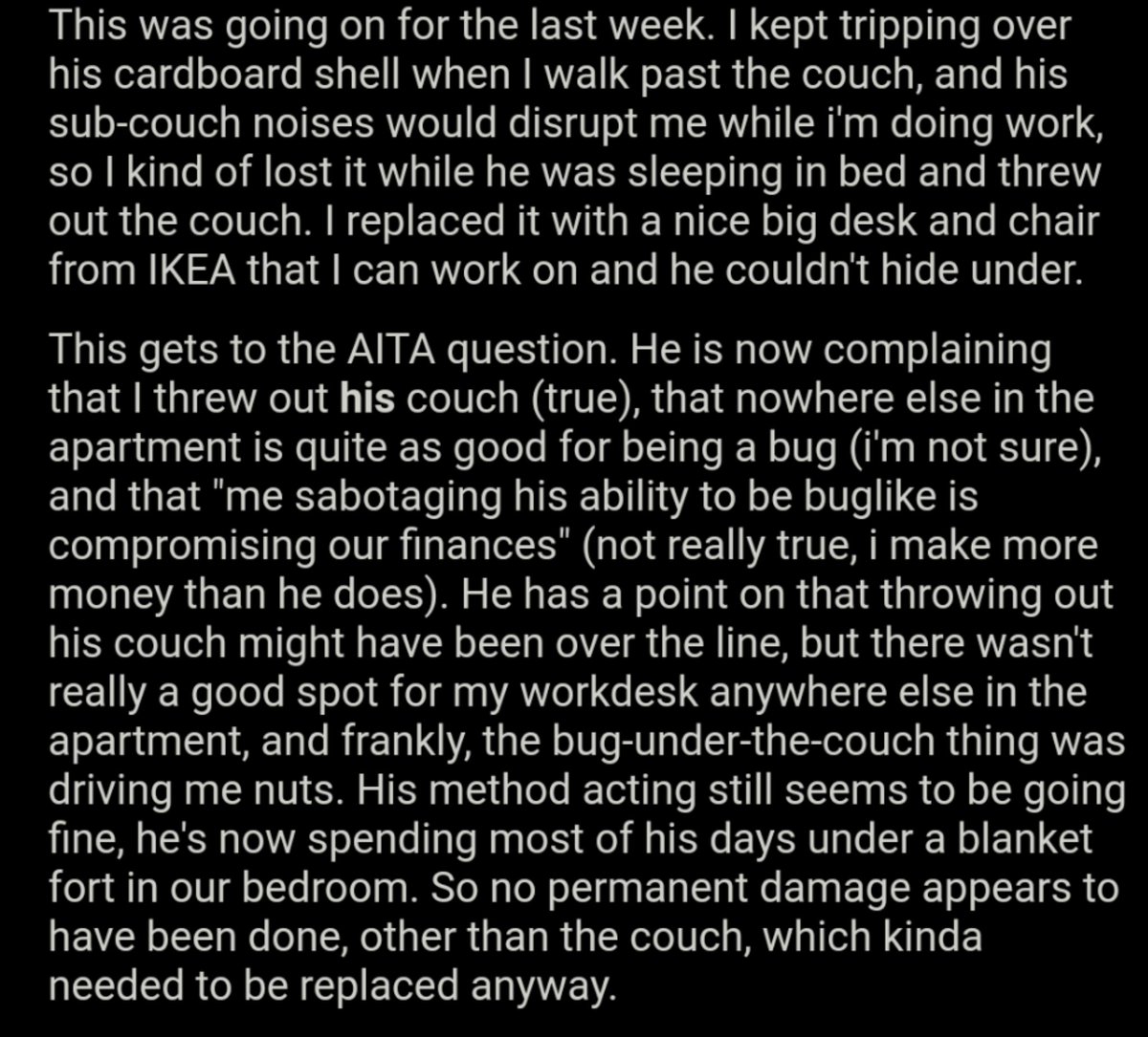 AITA for throwing away my husband's couch? He is pretending to be a beatle and it's driving me nuts. https://bit.ly/38tBlxc pic.twitter.com/pkDVAafi3h