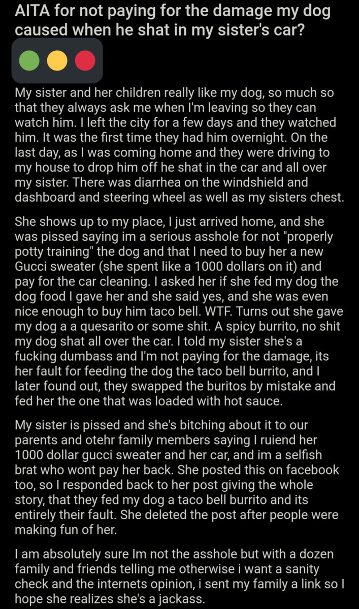 AITA for not paying for the damage my dog caused when he shat in my sister's car? https://bit.ly/3hu0tYO pic.twitter.com/HvbIRS9pO3