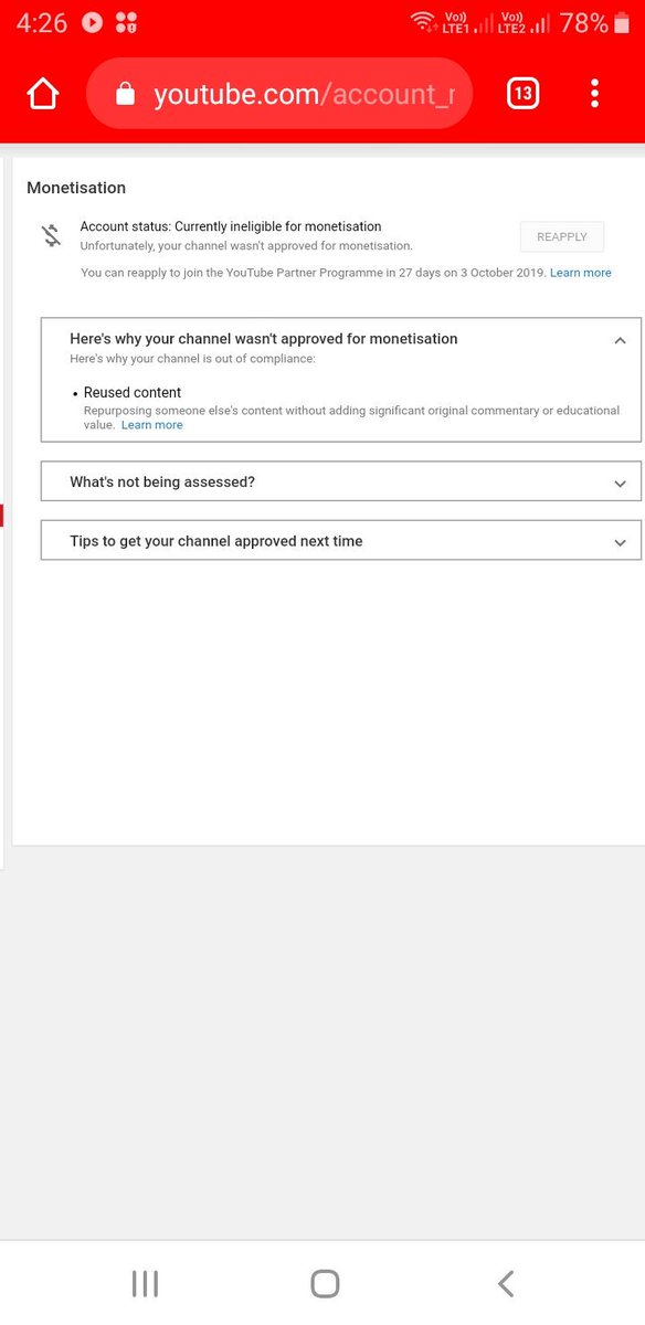 @TeamYouTube Why My Channel Is Continously Rejected By A FAKE Reason That I Have Re-Used the Contents But Honestly You Can Check Its All Original Content.And Its Does not have Any Single Copyrights,Community & Claims Strike On My Channel.Then Why you are Doing Partiality?pic.twitter.com/mK3o40pRP9