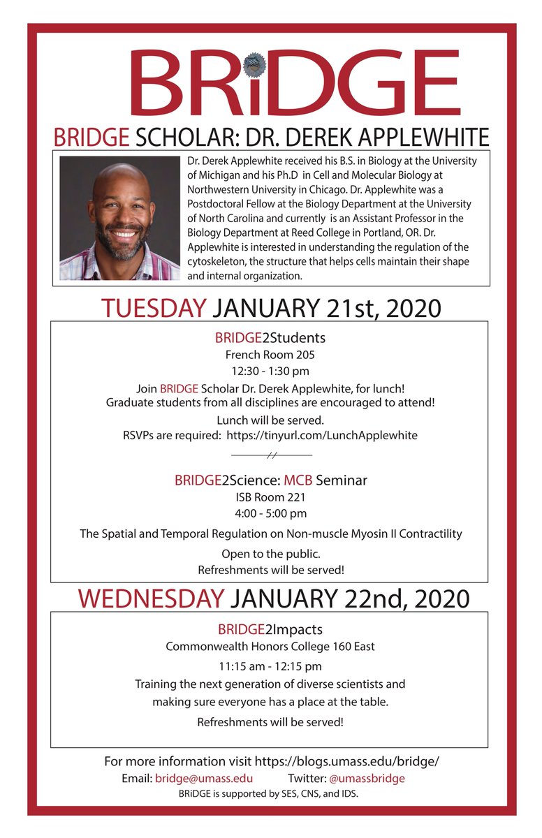 ! Please join us for BRiDGE2Students with @ApplewhiteDerek. It starts at 12:30 PM in French Hall 205. Hope to see you there!https://twitter.com/umassbridge/status/1217511487478038528 …