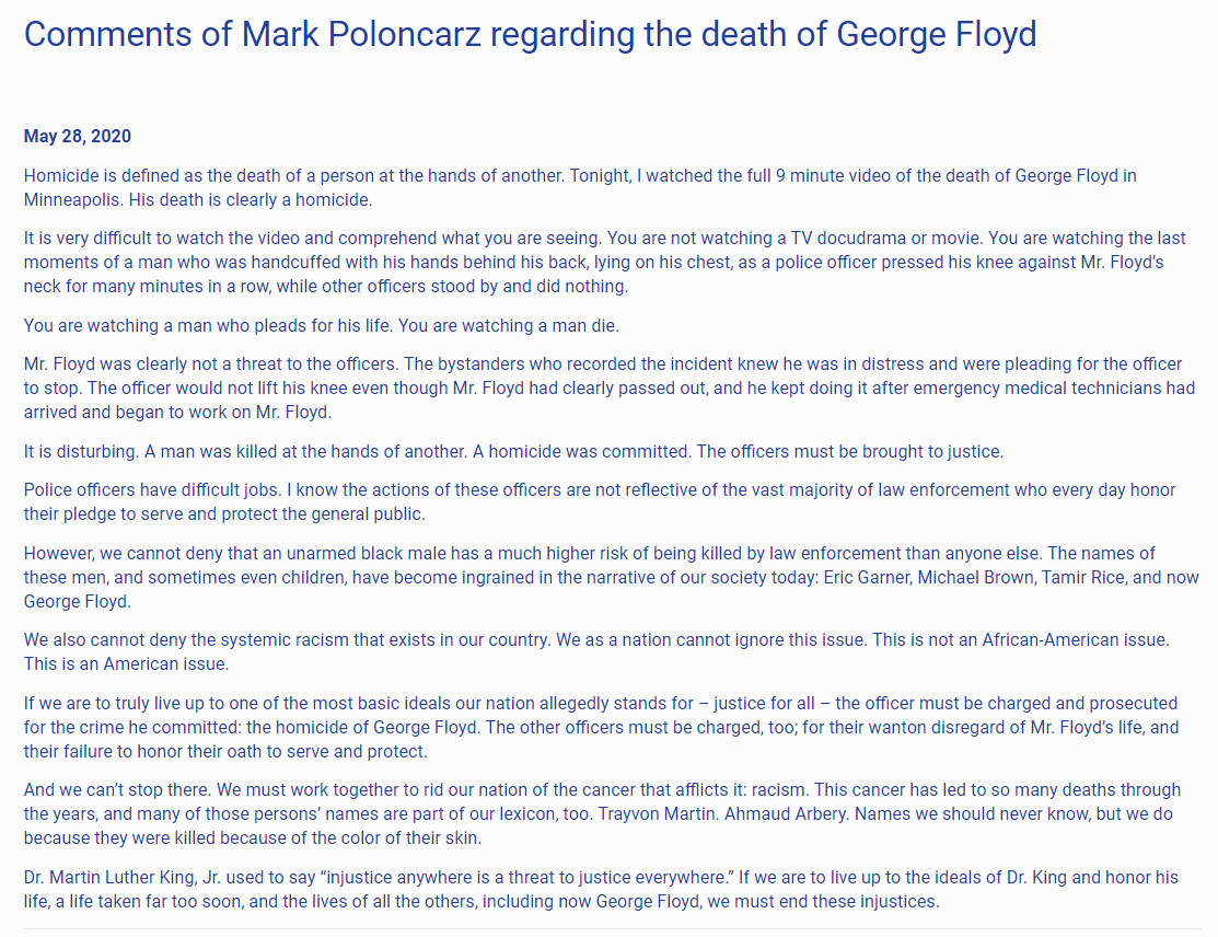 Last night I offered my thoughts on the death of George Floyd, how the officers must be held responsible for their actions, and "the American issue" of systemic racism in our nation. You can read my comments below and here: https://markpoloncarz.com/2020/05/comments-of-mark-poloncarz-regarding-the-death-of-george-floyd/ … pic.twitter.com/Lsg8Dap33x