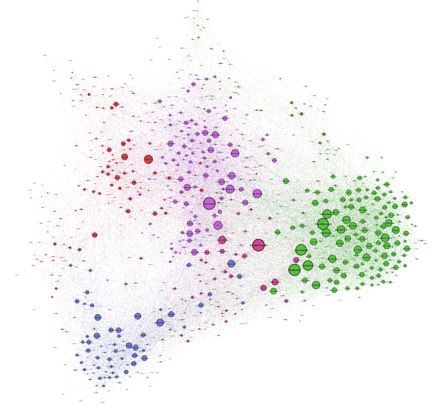 Note: I normally use a < 100k followers and > 5 in-degree filter. Michael's graph is so large I needed to use a > 40 in-degree filter to make it legible. pink: open science, climate change science, ecological sciencepic.twitter.com/571SZDTjnG