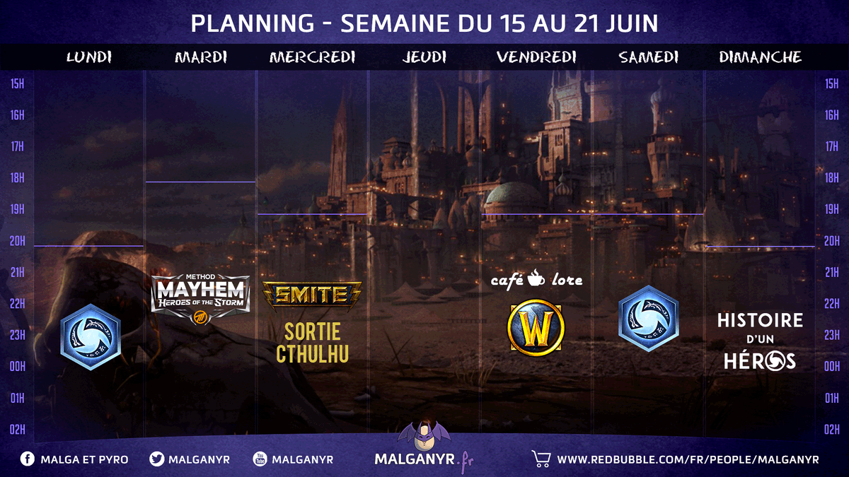 Voici le planning de la semaine ! Pas mal de surprises dans le lot -@Method #Mayhem avec @Menehots en co-cast -Du Smite avec Pyro et Eva mercredi -Découverte de Maldraxxus vendredi -Dignitache peut être samedi Bonne semaine à tous ! http://malganyr.fr pic.twitter.com/f4PdKbtOPB