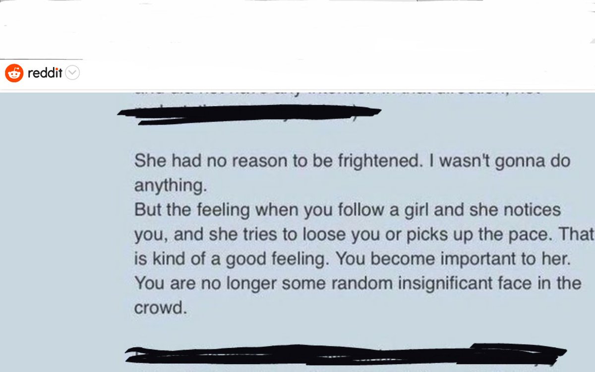 Just to give you an idea here's one of the more "moderate" posts. "Feelin' down? Go stalk a kid or woman at night. Making a chick fear for her life is a real pick-me-up." And these assholes wonder why women want nothing to do with them.pic.twitter.com/7lem0Qu0mo