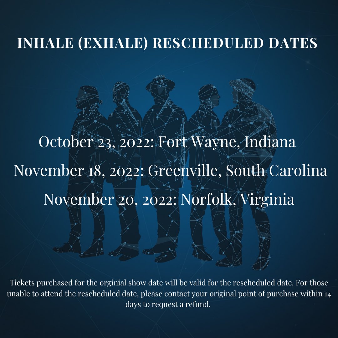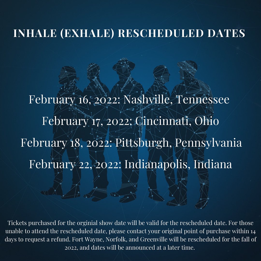 Important announcement from team MercyMe: The following shows have been postponed and will be rescheduled: 11/12 - Fort Wayne, IN 11/13 - Cincinnati, OH 11/14 - Nashville, TN 11/18 - Greenville, SC 11/19 - Norfolk, VA 11/20 - Pittsburgh, PA 11/21 - Indianapolis, INpic.twitter.com/bBPJpW4gcE