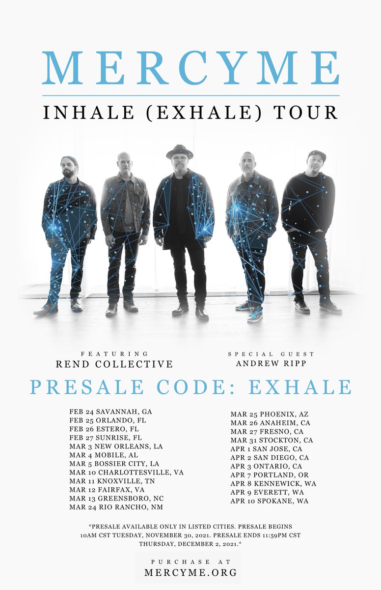 @rendcollective and@andrewripp. Presale will run through 11:59PM CST on Thursday, December 2, 2021. Visit http://MercyMe.org and use the code “EXHALE” to get your tickets.pic.twitter.com/9k4qeZwaV2