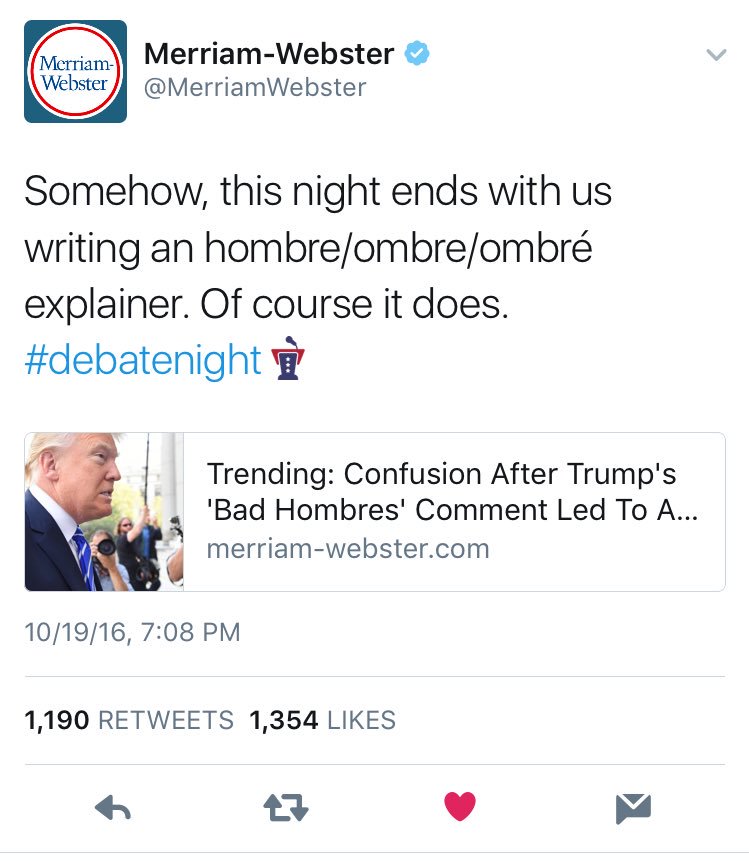@MerriamWebster: Somehow, this night ends with us writing an hombre/ombre/ombré explainer. Of course it does.#debatenightThanks. Twitter will use this to make your timeline better. UndoUndo