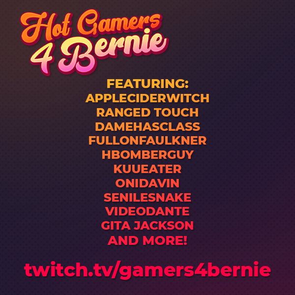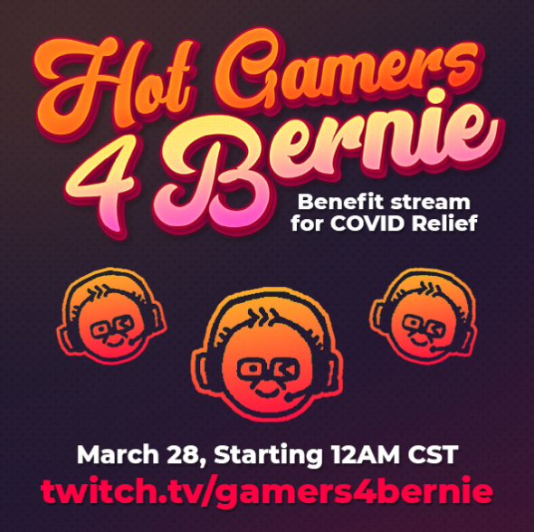 HEY Y'ALL: I am organizing a MASSIVE 24-HR STREAM to help raise money for COVID-19 RELIEF via ActBlue. If you are behind @SenSanders and want to help out and ALSO see some RAD GAMES on TWITCH, come hang out this Saturday, starting 12 midnight CENTRAL! http://twitch.tv/gamers4bernie pic.twitter.com/tHl7lZcr1B