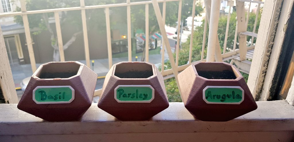 Nothing particularly special about them visually, but I 3d printed, stained and painted my new herb pots! I could stain them BC the filament used to print them has wood in it.pic.twitter.com/nT8iU9kZAG