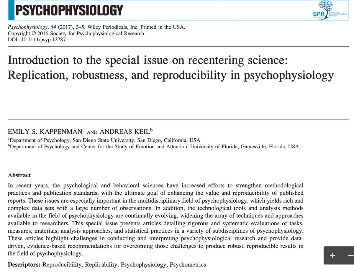 This special issue of Psychophysiology on replication, robustness, and reproducibility in psychophysiological research is excellent. It's encouraging to see journals that care about this stuff https://onlinelibrary.wiley.com/toc/14698986/2017/54/1 …pic.twitter.com/Ny3a4hkL0n