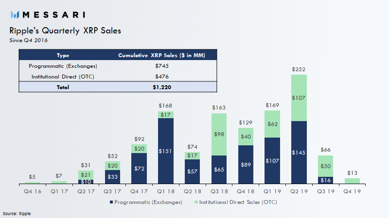 @Ripple sales of XRP hit lowest levels since Q1 '17 +$XRP sold by Ripple on exchanges dropped to zero and OTC sales dropped to just $13M + Drop coincides with $200M fundraise, possibly indicating prior sales have been for funding purposes https://messari.io/article/q4-2019-xrp-markets-report …pic.twitter.com/3xn2xUu2c8