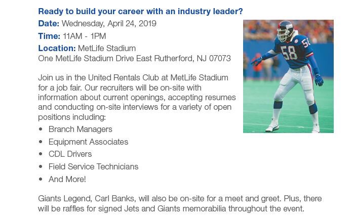 @UnitedRentals is hosting a job fair at MetLife Stadium on April 24 from 11am-1pm in the United Rentals Club and will be conducting on-site interviews for a variety of positions! More info