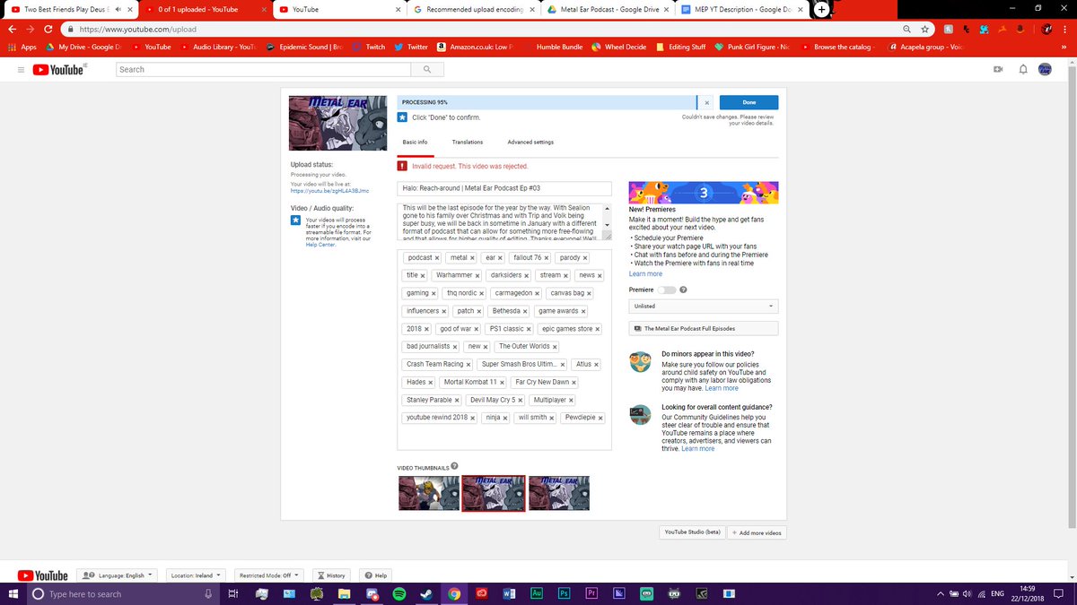 @TeamYouTube Trying to upload our next podcast episode but it's telling me "Invalid request. This video was rejected." but it won't tell me why or what I can change. The description is perfectly fine, there are no swear words or anything. I don't understand what the problem is.pic.twitter.com/YcPltzaqYD