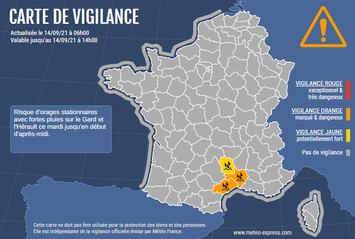 Des orages stationnaires engendrent un risque d'inondations jusqu'en début d'après-midi sur une partie de l'Hérault et du Gard.