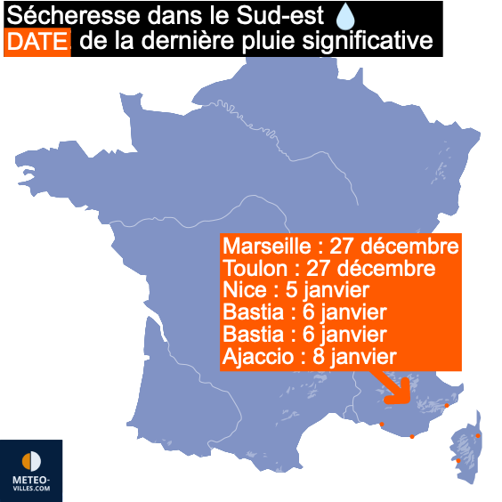 #Sécheresse : De nombreuses villes de#Provence,#CotedAzurFrance et#Corse n'ont pas reçu de#pluie significative depuis début janvier ou fin décembre ! L'épisode de lundi mettra fin à cette longue période MAIS ce sera seulement une parenthèse...pic.twitter.com/MiPNrjVCmC