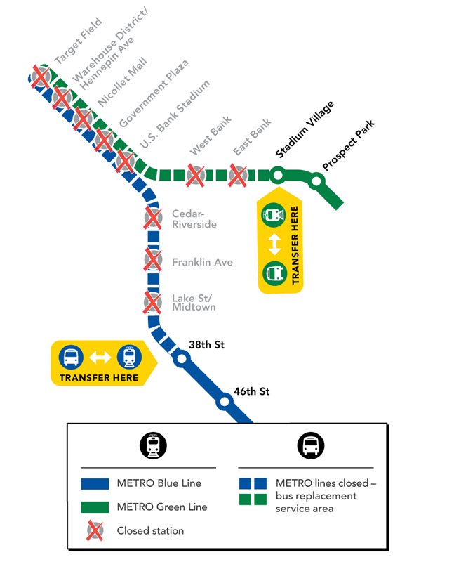 Heads up: Buses will replace Blue & Green Line trains at select stations beginning at 12:15 a.m. Saturday, Aug. 11 through 3:30 a.m. on Monday, Aug. 13 for work on ramp demolition, railbox repair, the Franklin Ave bridge and asphalt work on 11th Ave: http://ow.ly/l62S30libsp pic.twitter.com/Yv2md77Kzv