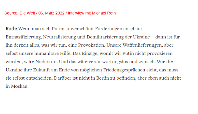 Putin sieht jegliche Einmischung in den Russland/Ukraine-Konflikt von außen als Provokation, so Micheal Roth im Welt-Interview. "Das Einzige, womit wir Putin nicht provozieren würden, wäre Nichtstun. Und das wäre verantwortungslos und zynisch. (...)."