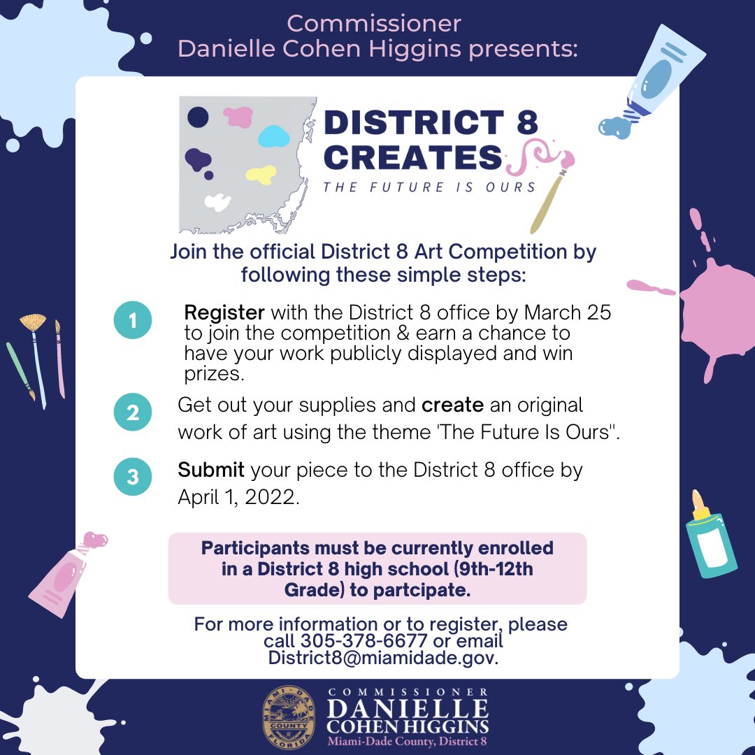 I am proud to support our youngest artists in South Dade w/ our D8 Creates Art competition! High-school artists in public school in D8 will have the chance to win amazing prizes like having their art displayed during Art Basel Week 2022 & annual passes to
