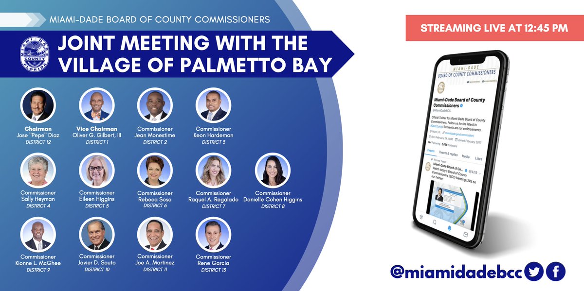 Tune in today at 12:45 p.m. to watch our joint meeting with the Village of Palmetto Bay LIVE on Facebook and Twitter! View agenda here: https://bit.ly/33rqc1v View meeting info here: https://bit.ly/33tszkn pic.twitter.com/4PXsyl7OpT